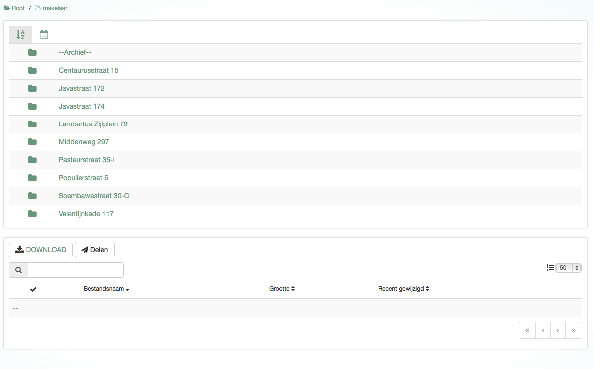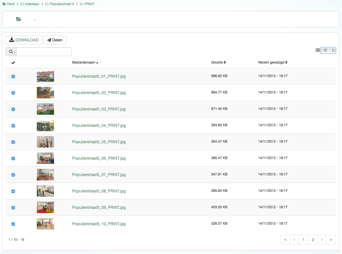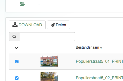 Door op DOWNLOAD te klikken worden alle bestanden in de map tegelijk gedownload in een ZIP bestand. Omdat meestal alle bestanden in een map gedownload worden, zijn alle bestanden in een map al geselecteerd als deze geopend wordt.