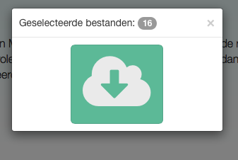 Ter controle staat in een klein popup venster het aantal geselecteerde bestanden en de definitieve download link. Door op het download icoon (wolkje met pijl) te klikken worden alle bestanden in één keer gedownload in een ZIP bestand. U kunt de download annuleren door het venster weg te klikken met het kruisje rechtsboven.